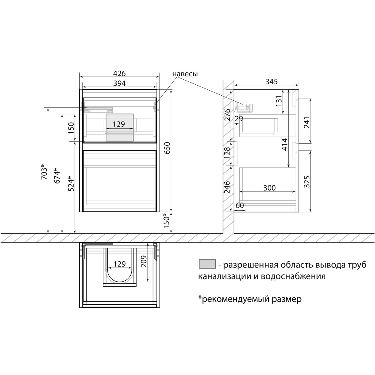 •Габариты без раковины (ШГВ): 426х345х650 мм;
