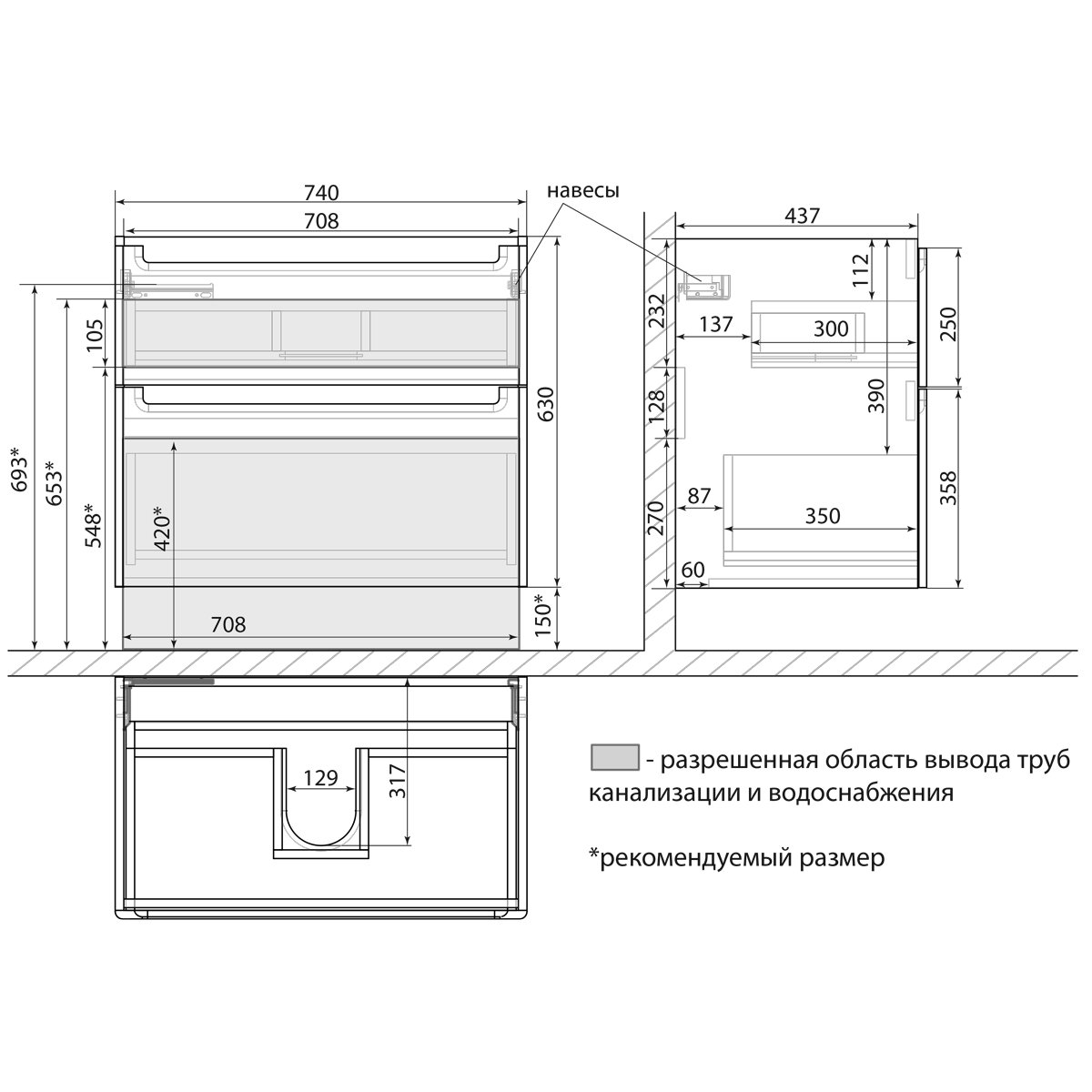 •Габариты без раковины (ШГВ): 740х453х630 мм;