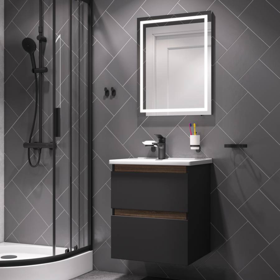 Комплект X-Joy – это самое эстетичное сочетание цветов и фактур: черные матовые фасады дополнены отделкой с фактурой под темное дерево. Смеситель и аксессуары идеально впишутся в современную ванную комнату и будут радовать глаз каждый день.