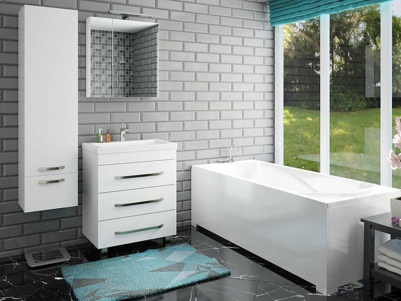 Мебель выполнена из влагостойкого ЛДСП и качественного MDF с использованием эмали RENNER (Италия). Дверцы снабжены системой Push-up. Для мебели используется фурнитура BLUM (Австрия).