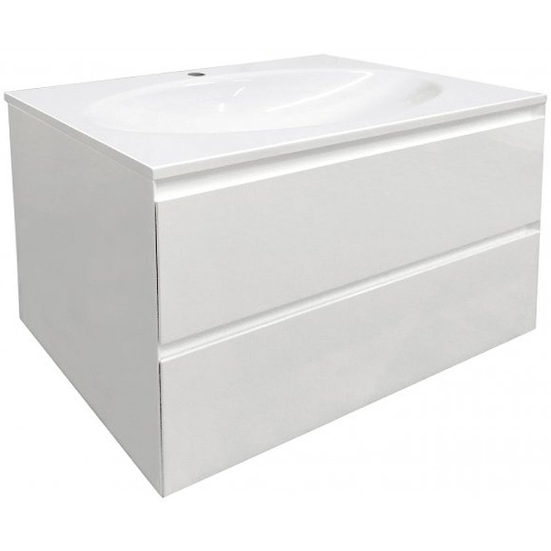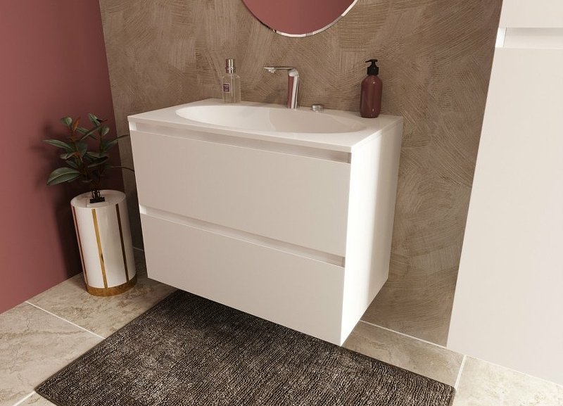Подвесная тумба укомплектована прямоугольной раковиной из литьевого мрамора, плавно перетекающая в овальную чашу, которая добавляет изящность мебели и передает атмосферу стиля. В тумбе расположены 2 вместительных ящика, интегрированные ручки выполнены за счет скошенных фасадов. Мебель выполнена из влагостойкого ЛДСП и качественного MDF с использованием эмали RENNER (Италия). Ящики снабжены системой плавного закрывания. Для мебели используется фурнитура BLUM (Австрия).