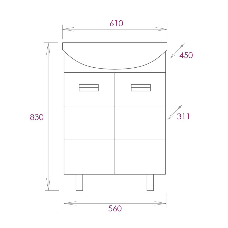 Размеры тумбы без учета раковины и ножек: 56x31x68 см.