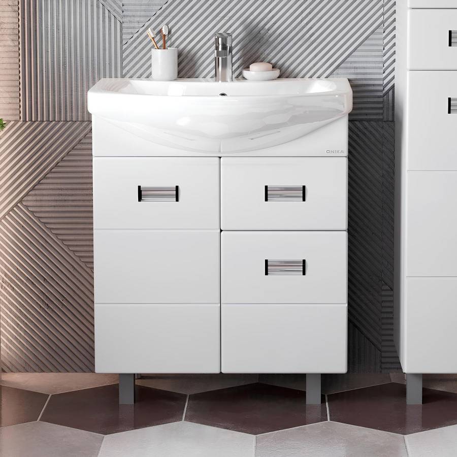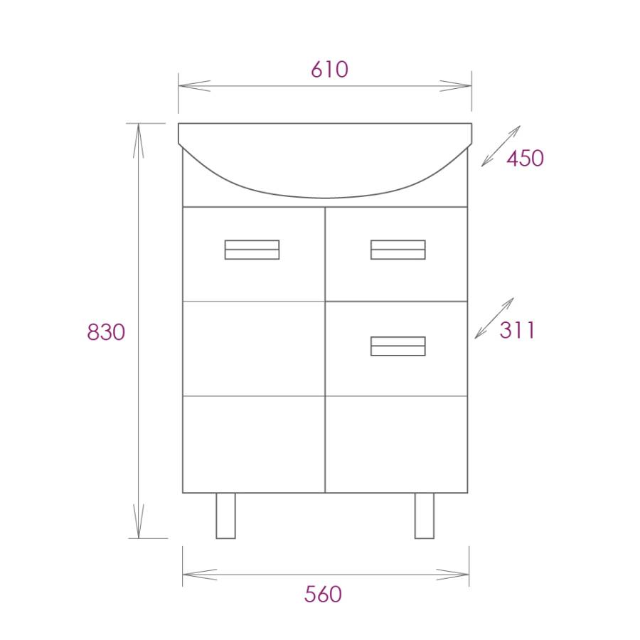 Размеры тумбы без учета раковины и ножек: 56x31x68 см.