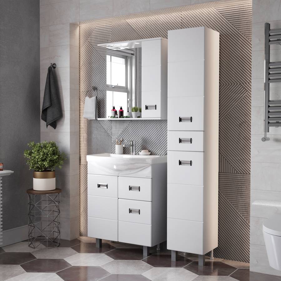 Глянцевый белый цвет фасада, ненавязчивая горизонтальная фрезеровка, врезные хромированные ручки и аккуратная лаконичность - все это позволяет коллекции Балтика стать центральным звеном интерьера ванной комнаты.
