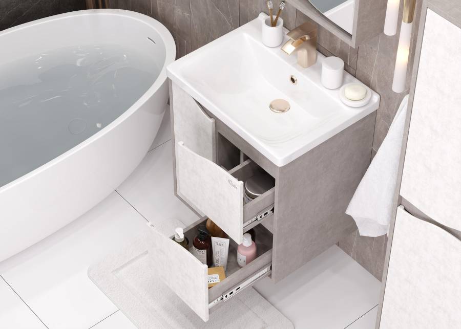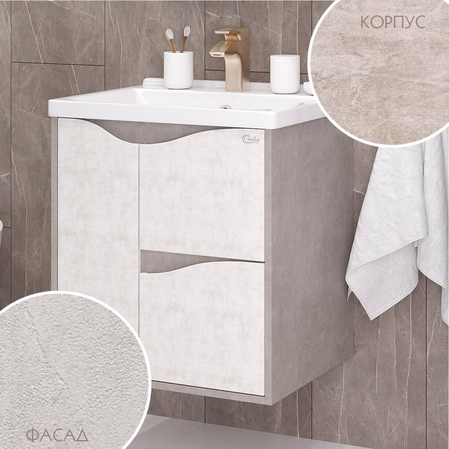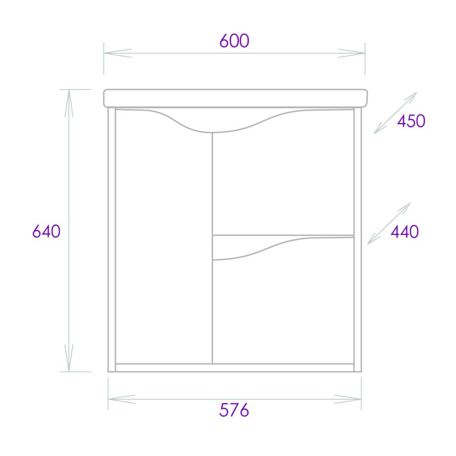 Размеры тумбы без учета раковины и ножек: 57x44x60 см.