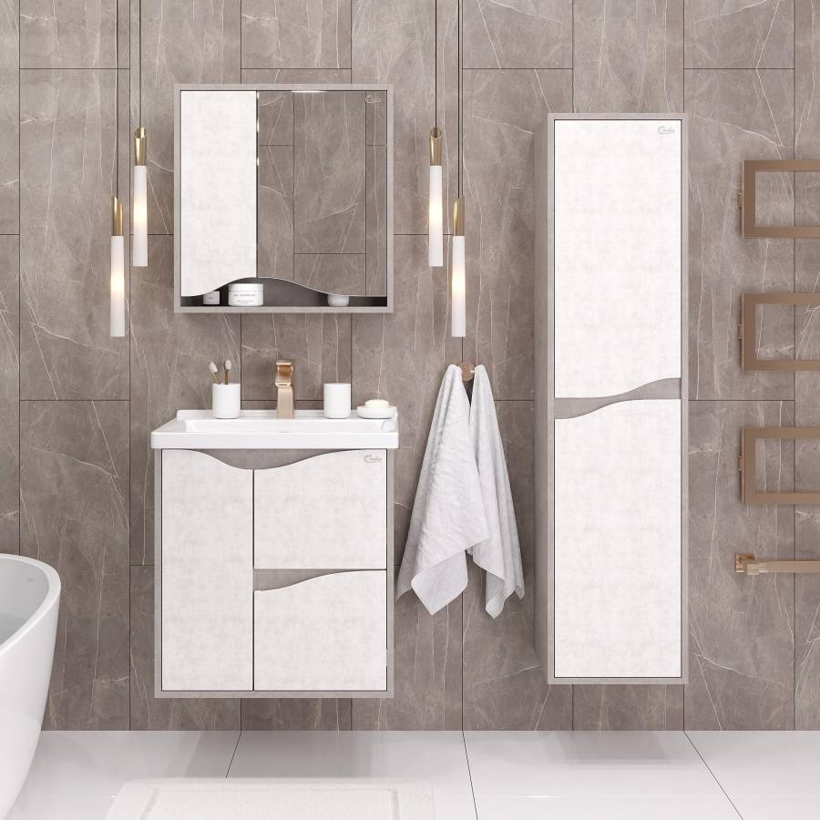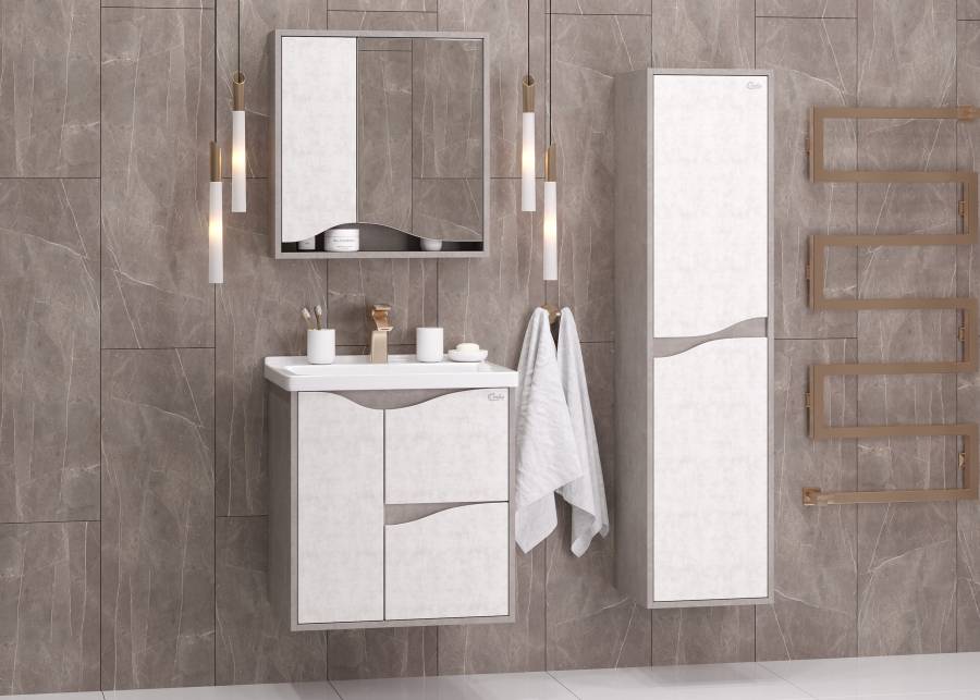 Корпус тумбы выполнен из ЛДСП, фасады ящиков - из ЛМДФ в пленке, устойчивых к механическим воздействиям, перепадам температур и высокой влажности, при этом тумба надежно крепится к стене и не занимает место на полу, не создавая при этом сложностей в уборке помещения.