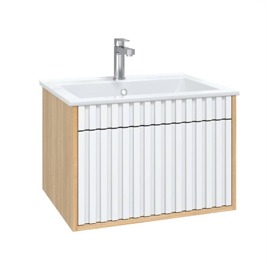 Рифленый белый матовый фасад с покрытием SoftTouch и корпус цвета дуба с роскошной текстурой подчеркнет изысканный вкус владельца и станет центральным элементом декора.
