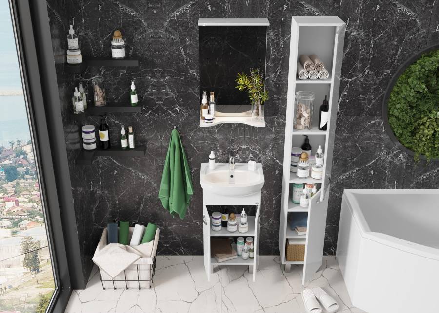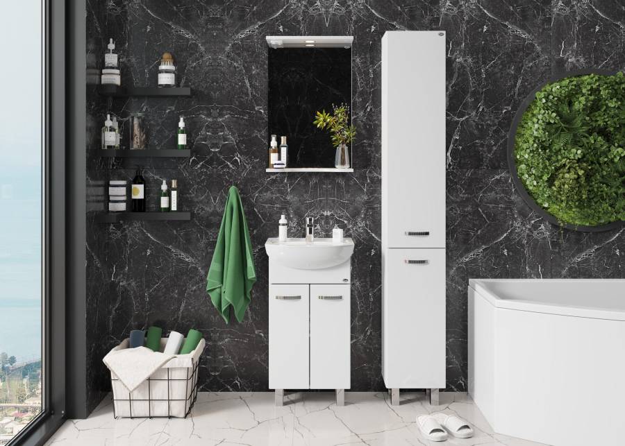 Строгие формы без декора и стильные хромированные ручки на двух распашных дверях, скрывают просторное внутреннее пространство с полкой для размещения необходимых бытовых принадлежностей.