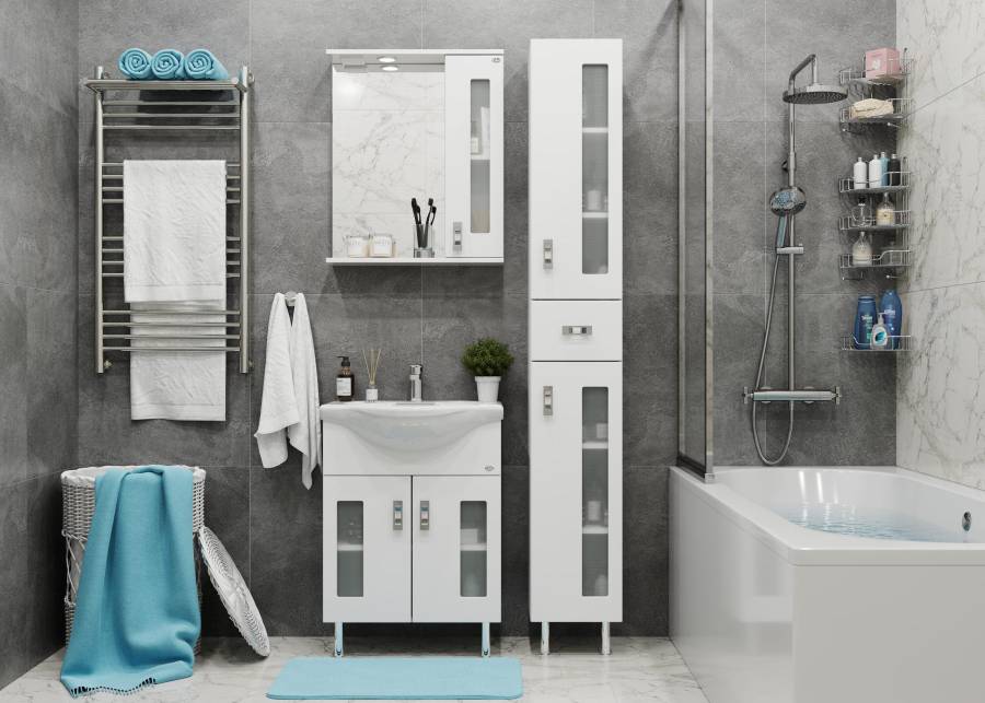 Белоснежный глянцевый цвет фасада в сочетании со вставками из матового стекла и хромированными ручками необычной формы придадут ванной комнате ощущение свежести, чистоты и уюта.