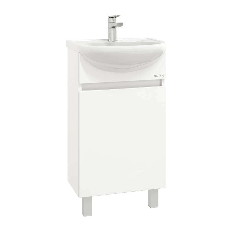 Тумба имеет белый глянцевый фасад и строгие формы без декора. За дверцей с интегрированной ручкой скрывается пространство с полкой для размещения необходимых бытовых принадлежностей.