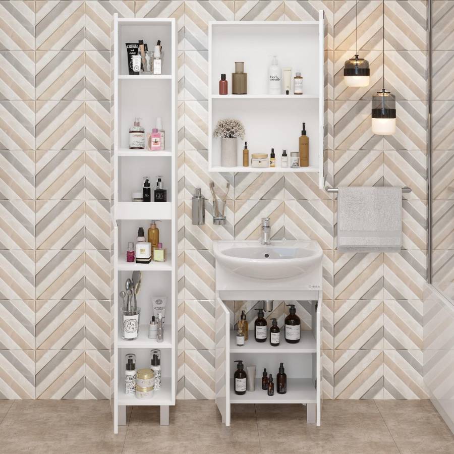 Тумба имеет белый глянцевый фасад и строгие формы без декора. За дверцей с интегрированной ручкой скрывается пространство с полкой для размещения необходимых бытовых принадлежностей.