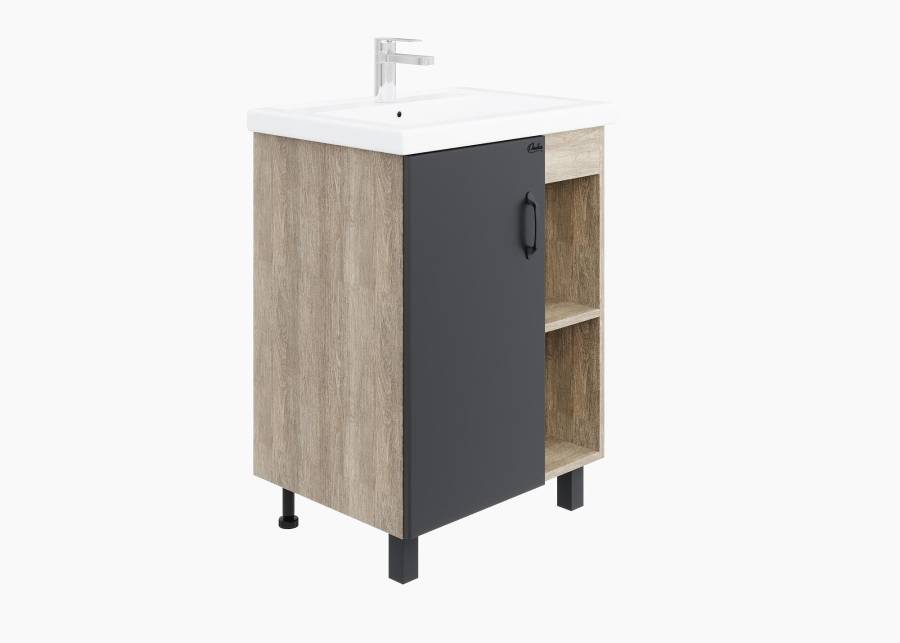 Открытые полки справа обеспечивают быстрый доступ к часто используемым аксессуарам, а пространство за распашной дверцей слева, снабженной системой плавного закрывания, станет удобным местом для хранения различных бытовых принадлежностей.