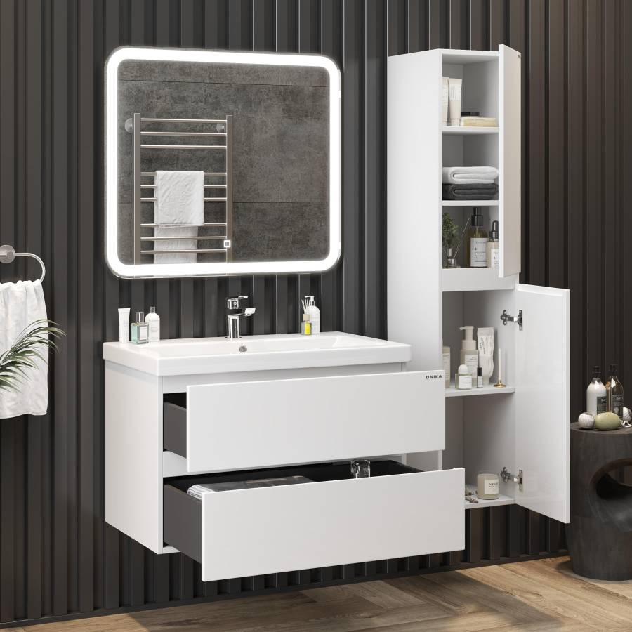 Два вместительных ящика с направляющими скрытого монтажа с доводчиками помогут организовать пространство в ванной комнате и компактно разместить необходимые вещи.