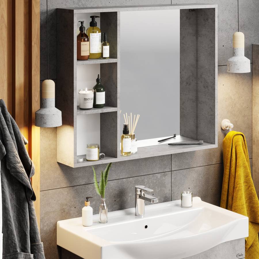 3 открытые полки обеспечивают быстрый доступ к часто используемым аксессуарам, место под зеркалом предназначено для косметических средств или декоративных элементов.