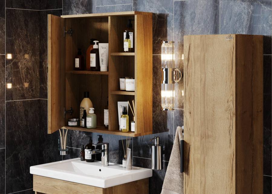 Открытые полки обеспечивают быстрый доступ к часто используемым аксессуарам, а пространство за распашной зеркальной дверцей с механизмом плавного закрывания, разделенное полочкой, станет удобным местом для хранения различных бытовых принадлежностей.