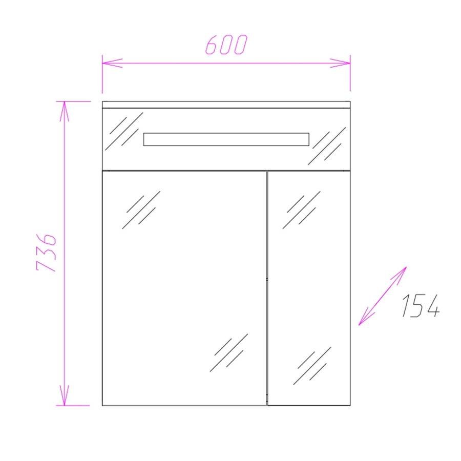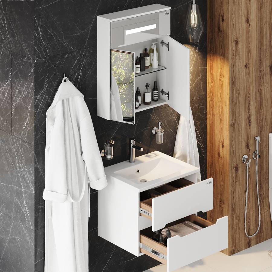 Внешне это отражается в лаконичной прямоугольной форме без ручек и лишнего декора и стильной подсветке, в функционально - в двух дверцах разного размера с механизмом плавного закрывания, скрывающих просторное пространство для хранения необходимых вещей, разделенное на 2 части стеклянной полочкой с еврокромкой.