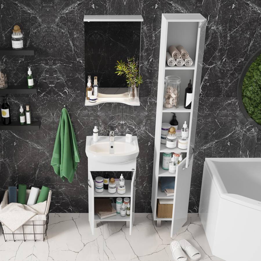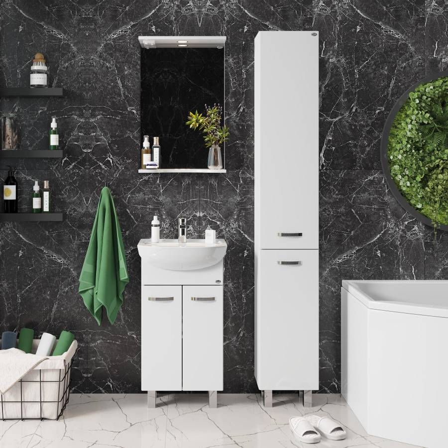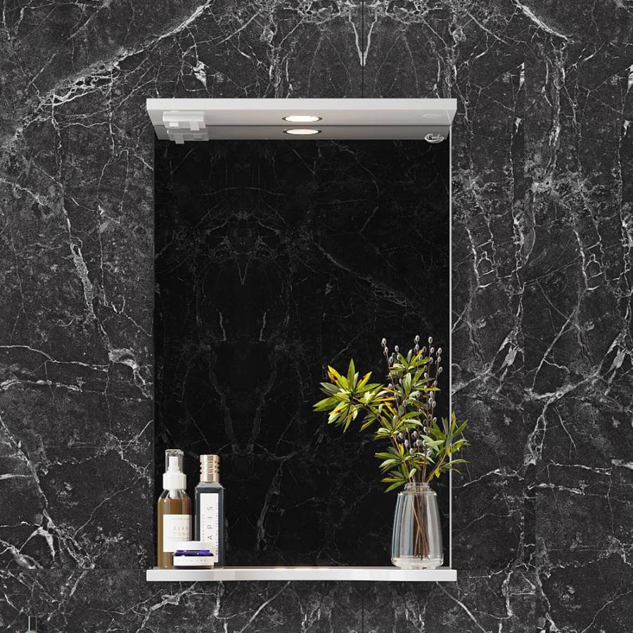 Основа для зеркала выполнена из ЛДСП, полка и козырек - из МДФ в пленке, устойчивых к механическим воздействиям, перепадам температур и высокой влажности.