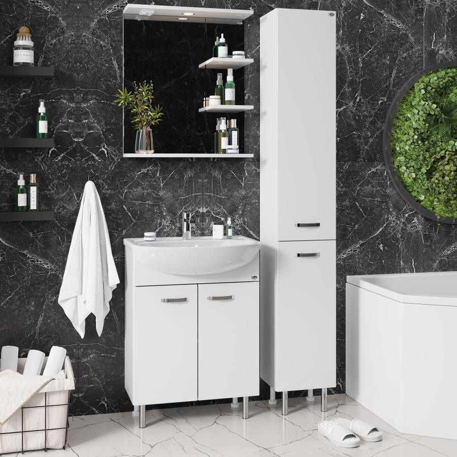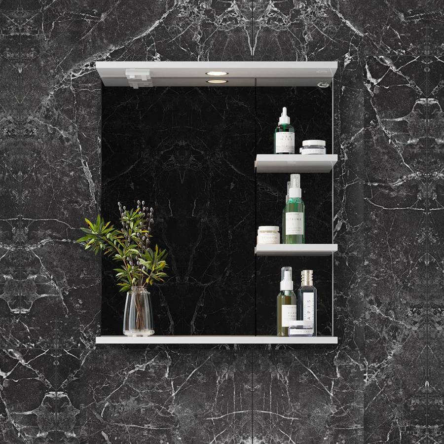 Основа для зеркала выполнена из ЛДСП, полка и козырек - из МДФ в пленке, устойчивых к механическим воздействиям, перепадам температур и высокой влажности