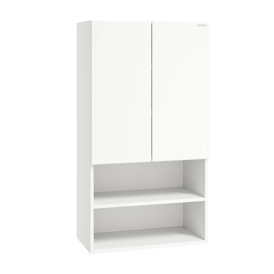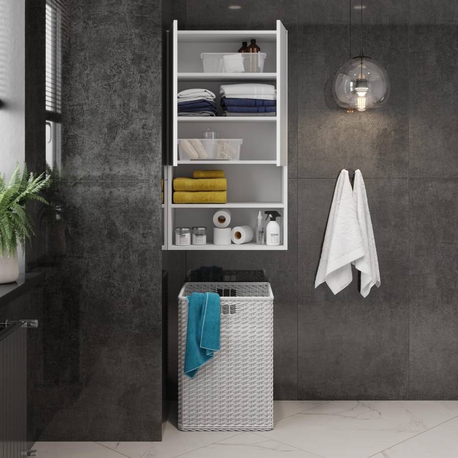 Компактные габариты позволяют грамотно организовать небольшой санузел: подвесной шкаф можно разместить над стиральной машиной. Открытые полки снизу и пространство за распашными дверцами с доводчиками помогут разместить все необходимые вещи.