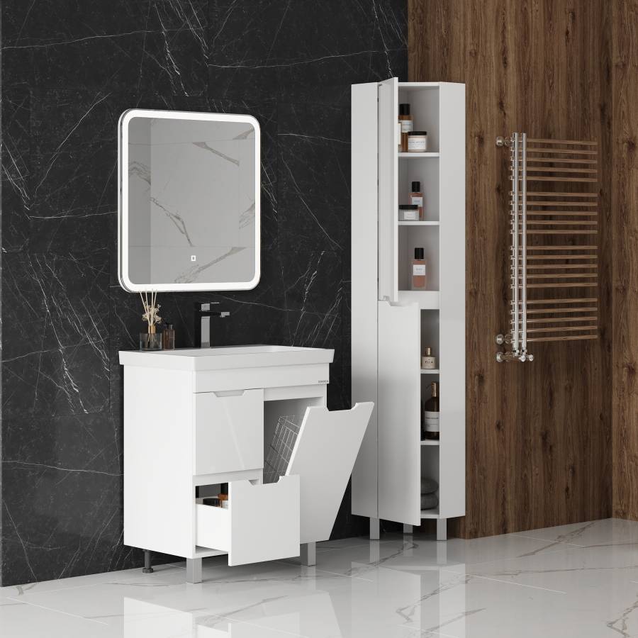 Пенал имеет два отделения за распашными дверцами с доводчиками, полки внутри регулируются по высоте. Ручки, изящно интегрированные в фасады, позволяют сделать эксплуатацию мебели более удобной и практичной.