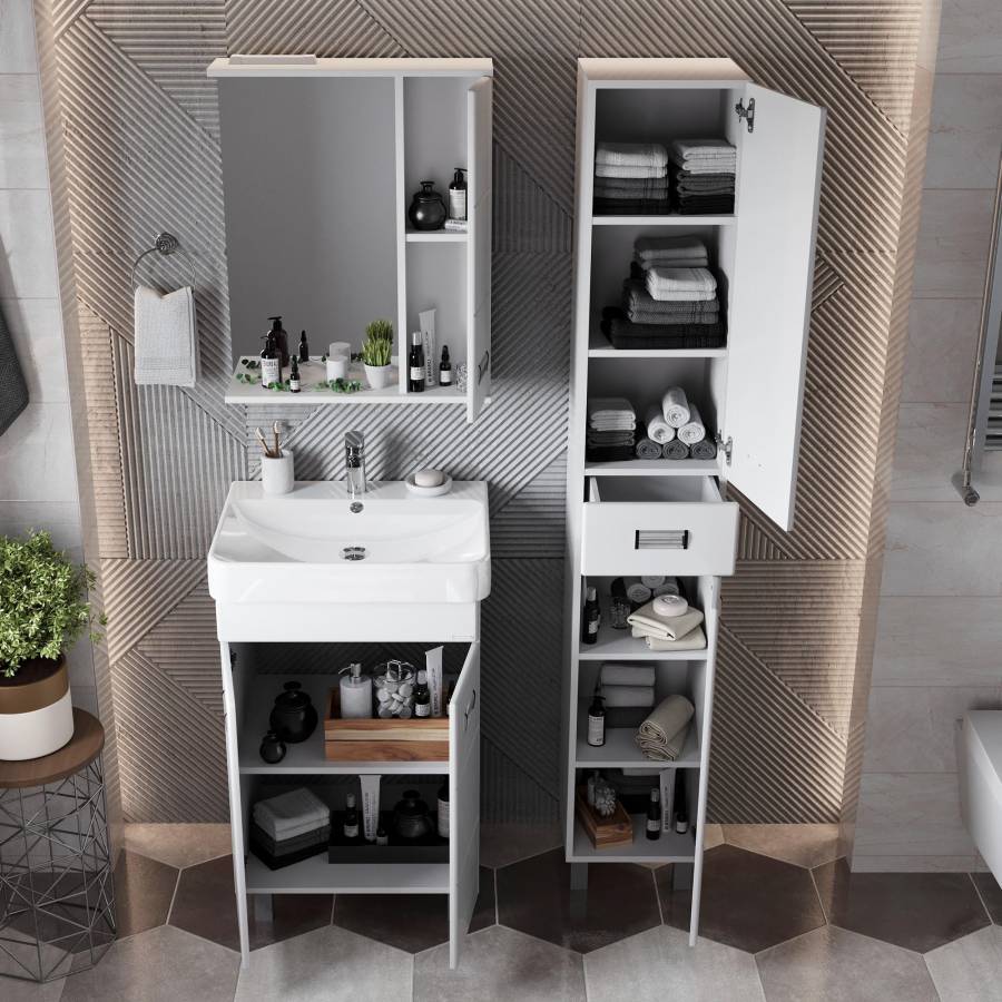 Удобный ящик с направляющими полного выдвижения посередине пенала и два больших отделения, разделенные горизонтальными полочками, за распашными дверями с механизмом плавного закрывания - отличное место для хранения необходимых вещей.