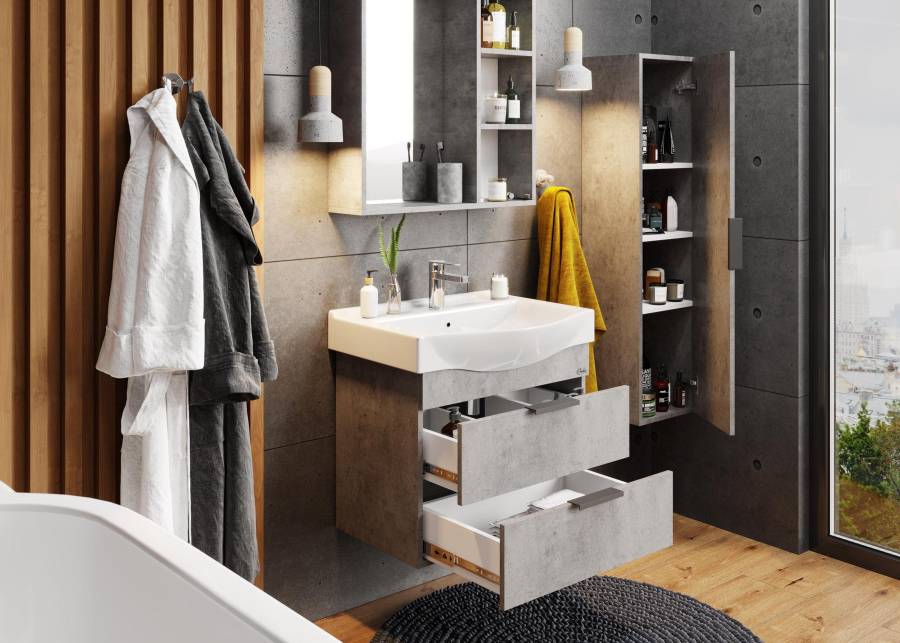 Внутреннее пространство пенала поделено полками на 4 секции, что позволяет разместить различные косметические средства. Дверь снабжена механизмом плавного закрывания.