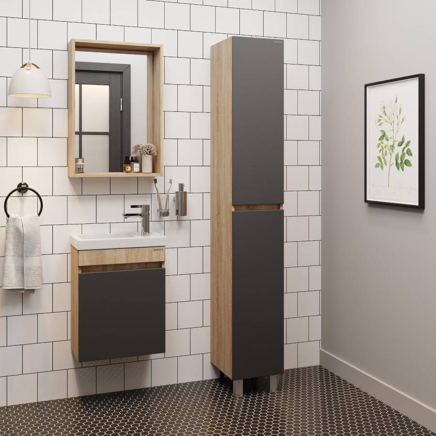 Корпус пенала выполнен из ЛДСП, фасад - из МДФ в пленке, специально предназначенных для использования в условиях высокой влажности.