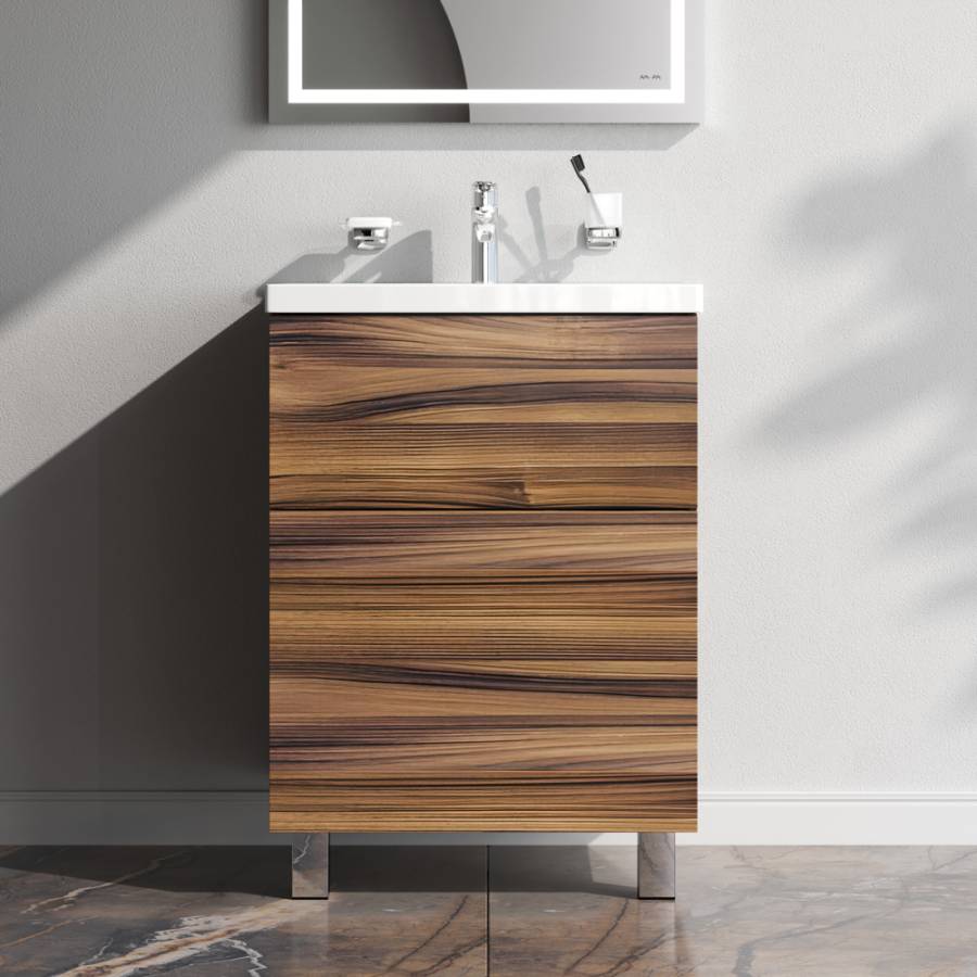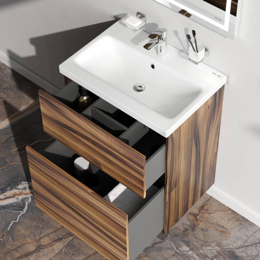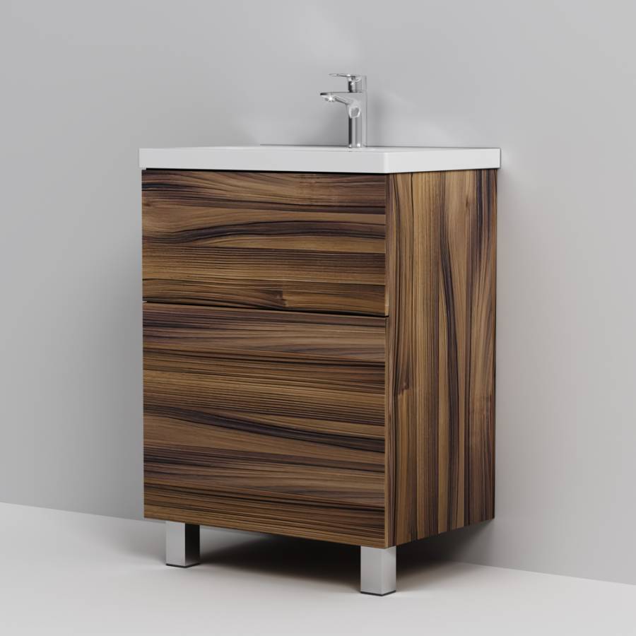 Представляем расширение цветовой палитры коллекции Gem в цвете “орех”. Напольная база под раковину изготовлена из влагостойкого ЛДСП. Внутреннее пространство двух вместительных ящиков представлено в цвете антрацит с антискользящим эффектом. _x000D_