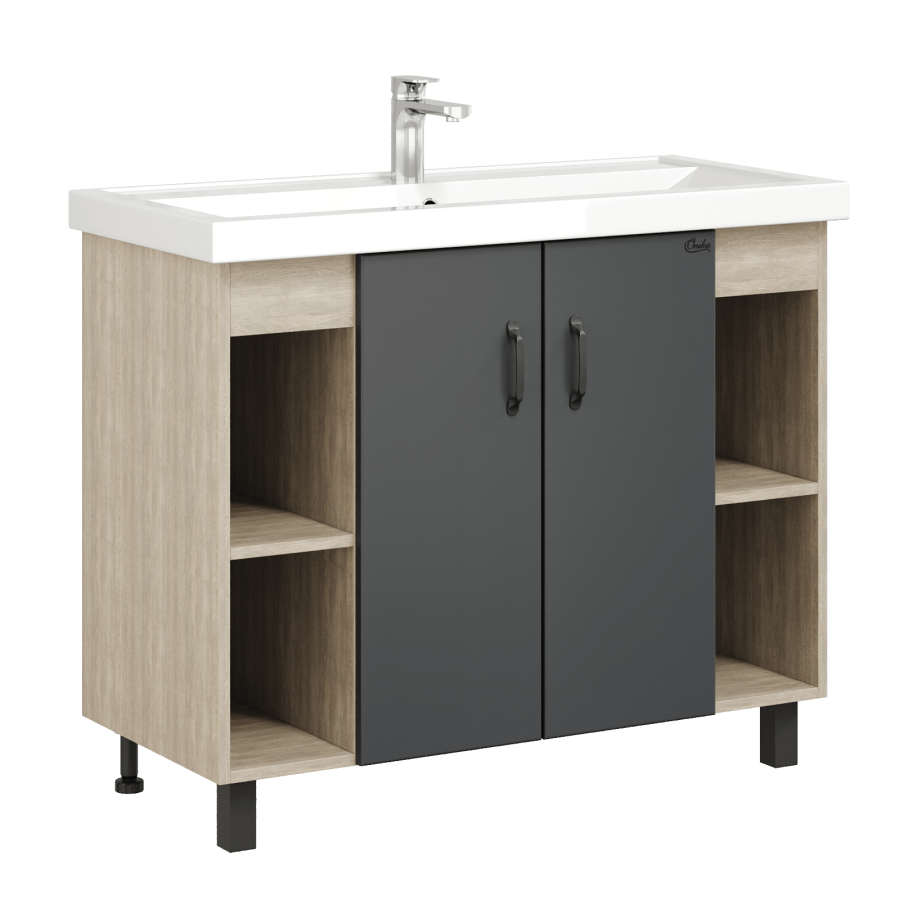 Открытые полки по бокам от основного отделения обеспечивают быстрый доступ к часто используемым аксессуарам, а пространство за распашными дверцами с доводчиками по центру тумбы, станет удобным местом для хранения различных бытовых принадлежностей.