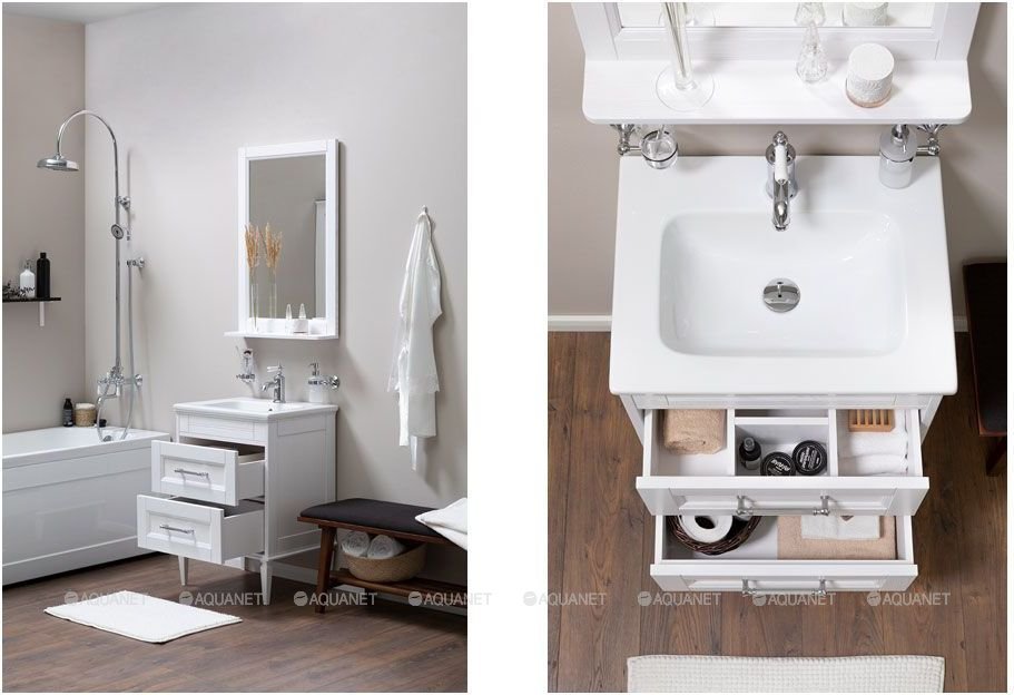 Открытая полка обеспечивает быстрый доступ к часто используемым аксессуарам, а пространство за распашной дверцей, оснащенной механизмом плавного закрывания, будет удобным местом для хранения различных бытовых принадлежностей.