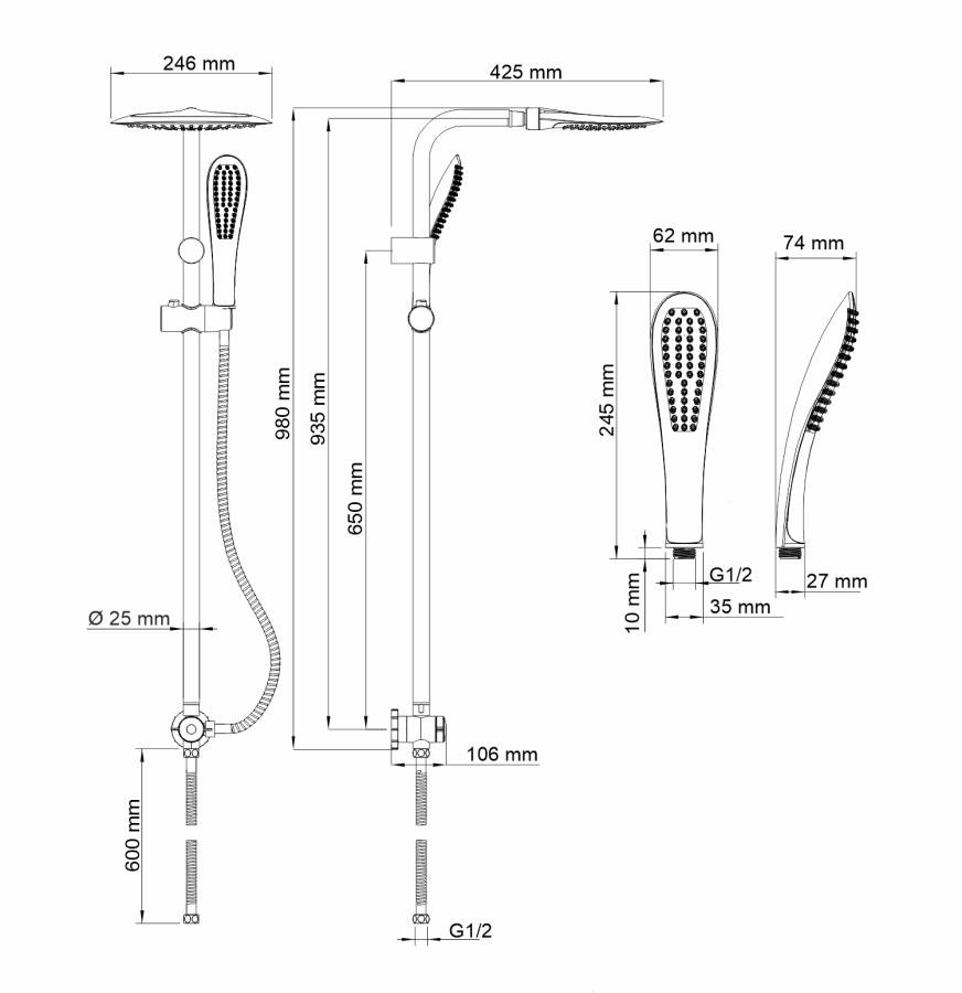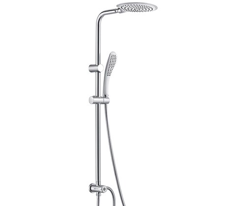 Душевая насадка, 246x190 мм, 110 форсунок, ABS-пластик, Стойка для душа, 25 мм, Лейка 1-функциональная с системой защиты от известковых отложений, Шланг металлический 1500 мм, подключение к лейке, Шланг металлический 600 мм, подключение к смесителю, Керамический поворотный переключатель, Регулируемый держатель лейки, Набор для монтажа |