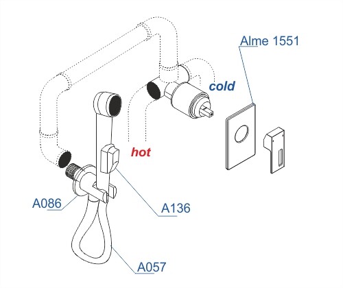 Смеситель для душа Alme 1551, Подключение шланга A086, Шланг для душа 1200 мм А057, Гигиеническая лейка с фиксатором А136 |