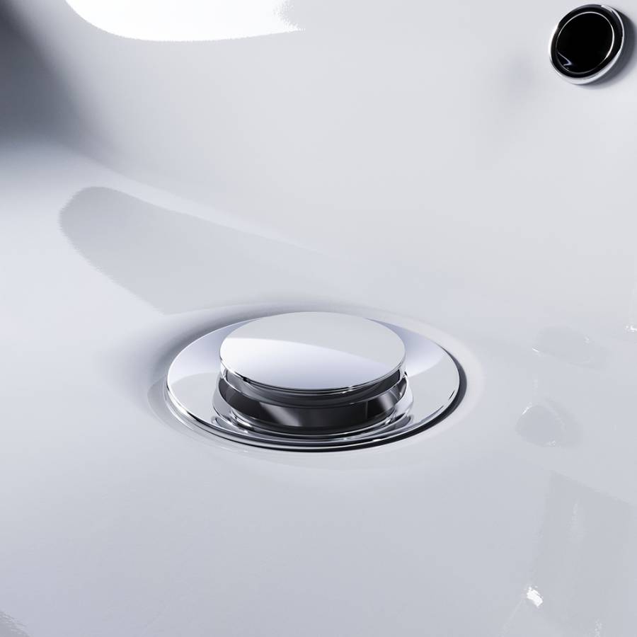 Система клик-клак управляется нажатием на пробку слива. Покрытие устойчиво к коррозии появлению царапин сколов и потускнению. Круглая заглушка в цвете Хром.