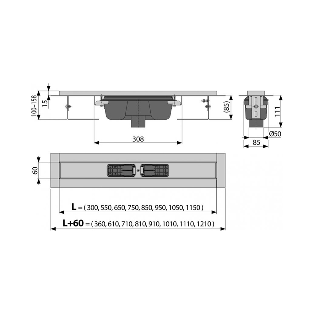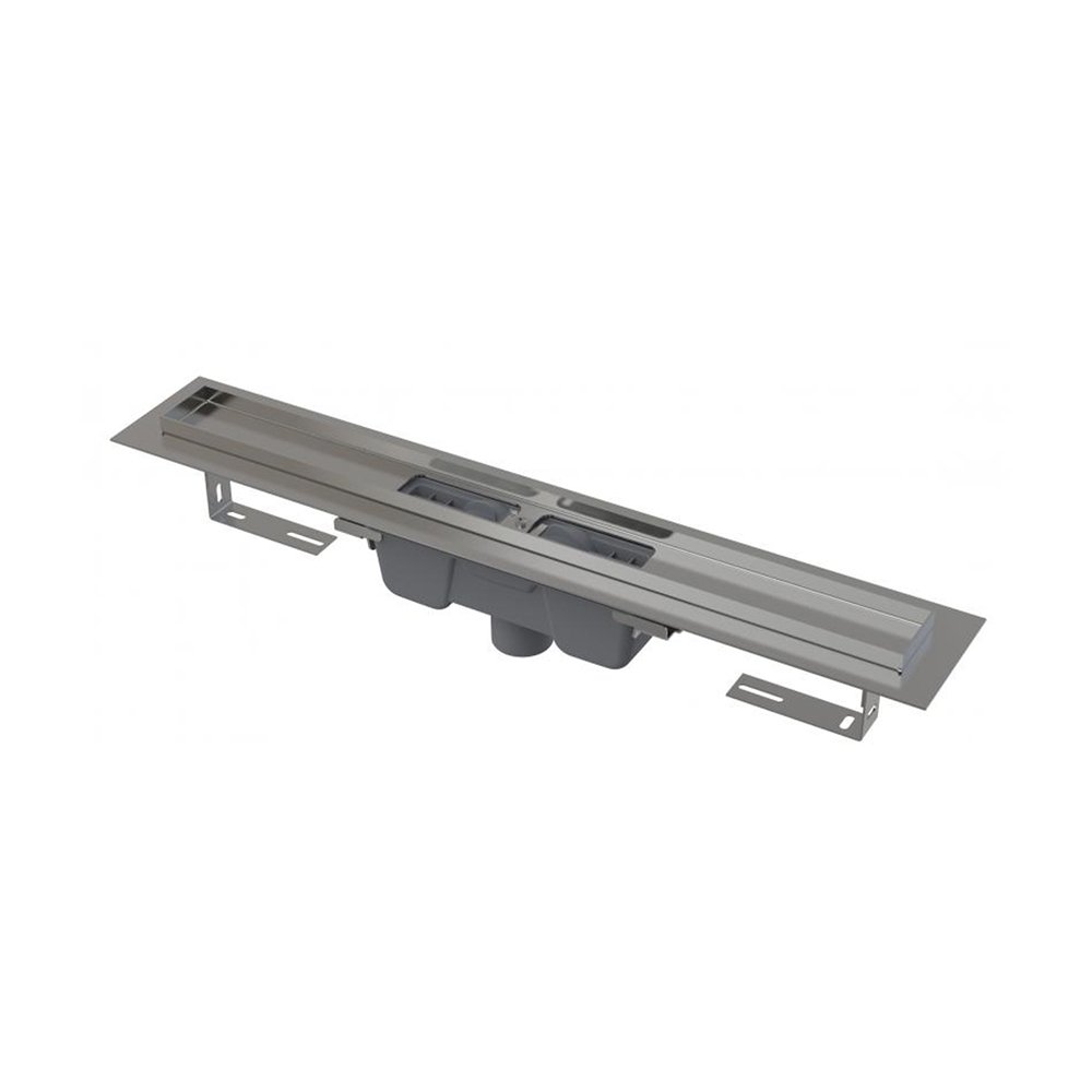 Водоотводящий желоб с сифоном Монтажный набор: шуруп Ø6×50 – 2 шт., дюбель Ø10 – 2 шт. Самоклеящиеся гидроизоляционные ленты Защитная пленка для воротника желоба и впускного отверстия сифона Монтажный вкладыш для защиты лотка желоба Монтажный набор для крепления регулируемых ножек: шуруп M6×12 – 2 шт. |