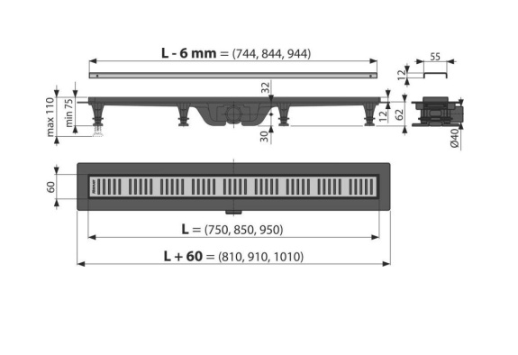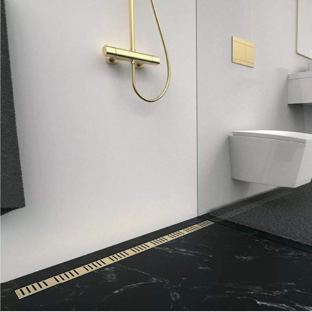 Водоотводящий желоб; Монтажный комплект: винт Ø4 – 4 шт., 2×38, дюбель Ø8 – 4 шт.; Самоклеящиеся гидроизоляционные ленты; Перфорированная решетка из нержавеющей стали Simple 10 матового цвета в охранной пленке; Монтажный комплект для крепления регулируемых ножек: винт 4,2×9,5 – 4 шт.; Гидрозатвор – комбинированный SMART; Регулируемые по высоте ножки 2 шт. |