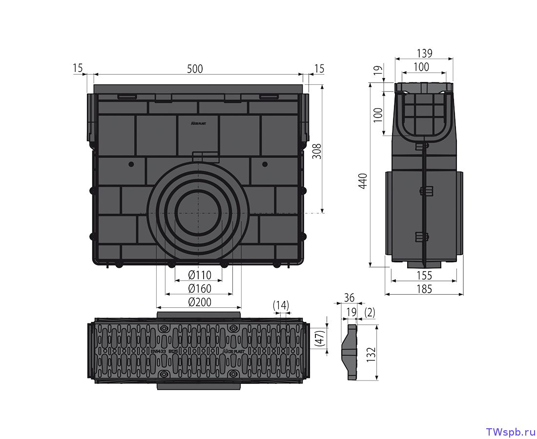 Корпус желоба с пластиковой рамой Композитная решетка – 2×0,5 м – класс нагрузки B125 Болты для крепления решетки в канале – 8 шт. |