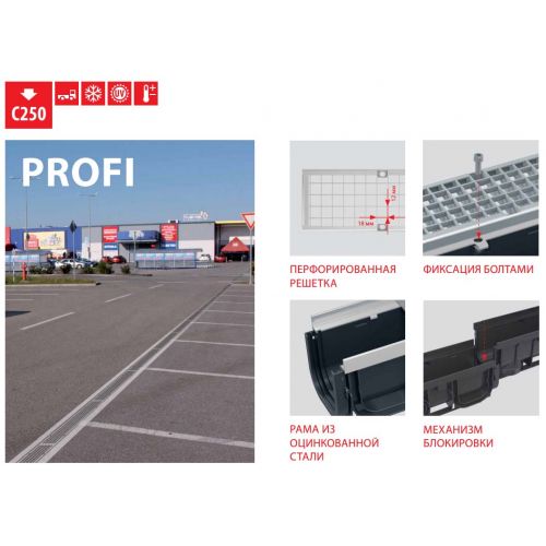 Оцинкованная перфорированная решетка – фиксация в корпусе канала с помощью четырех болтов из нержавеющей стали, размер сливных ячеек 12×18 мм |