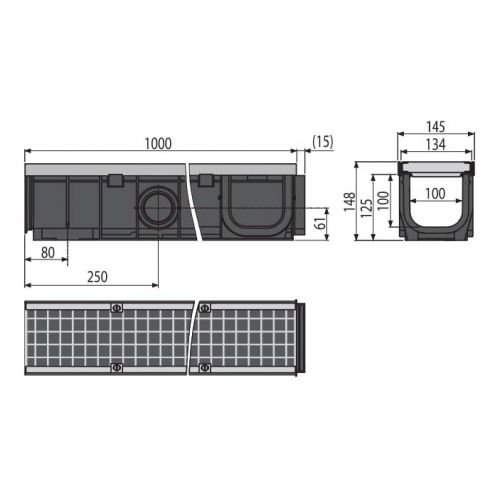 Корпус желоба с металлической рамой Установочные распорки – 2 шт. Оцинкованная решетка – сварная – класс нагрузки C250 Болты для крепления решетки в канале – 4 шт. |