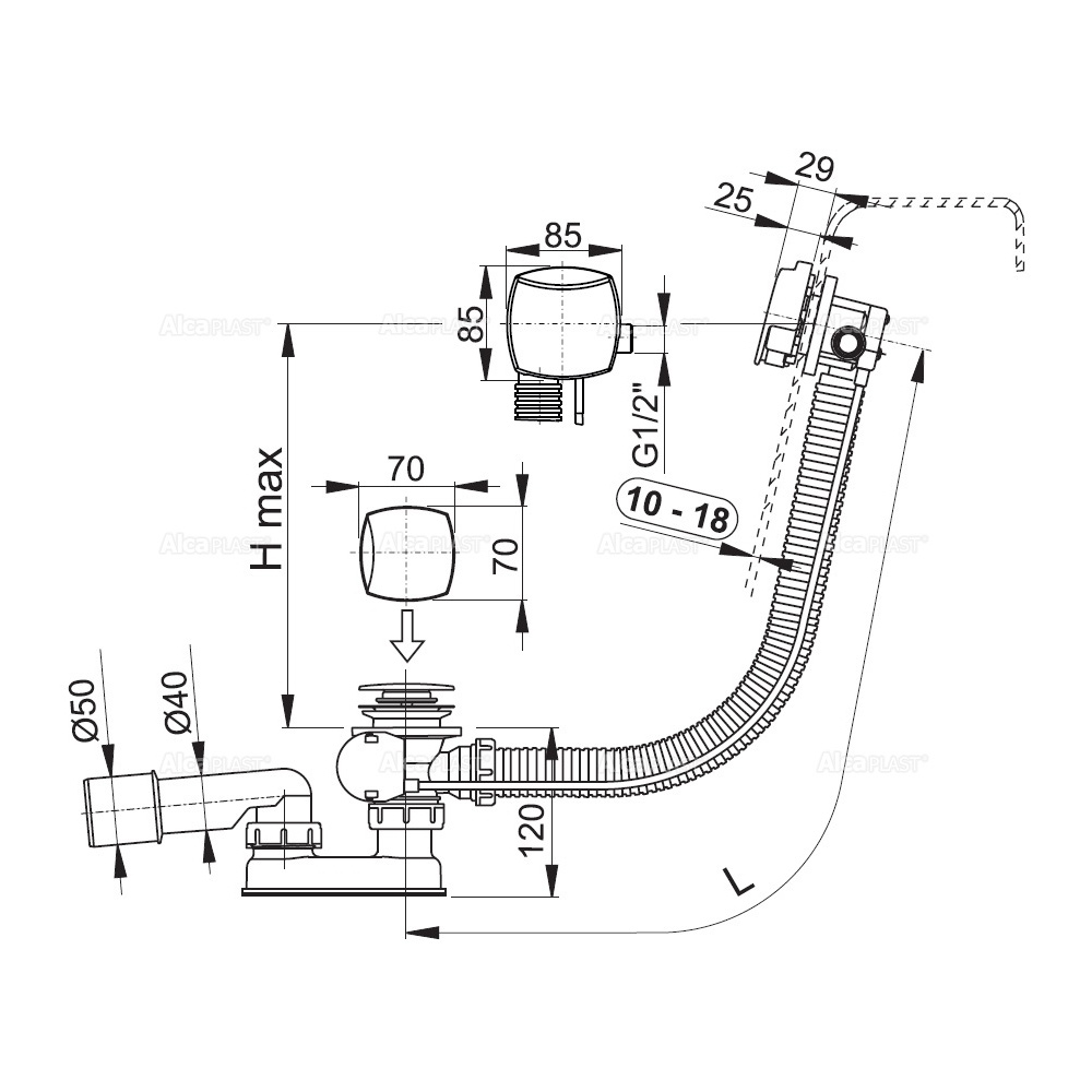 Корпус сифона с системой перелива; Поворотная стальная накладка, хромированная; Хромированная стальная пробка; Хромированная решетка слива из латуни; Гидрозатвор сифона из полипропилена, сваренный ультразвуковым методом, устойчив к термическим и химическим воздействиям; Монтажный комплект; Профильное уплотнение. |