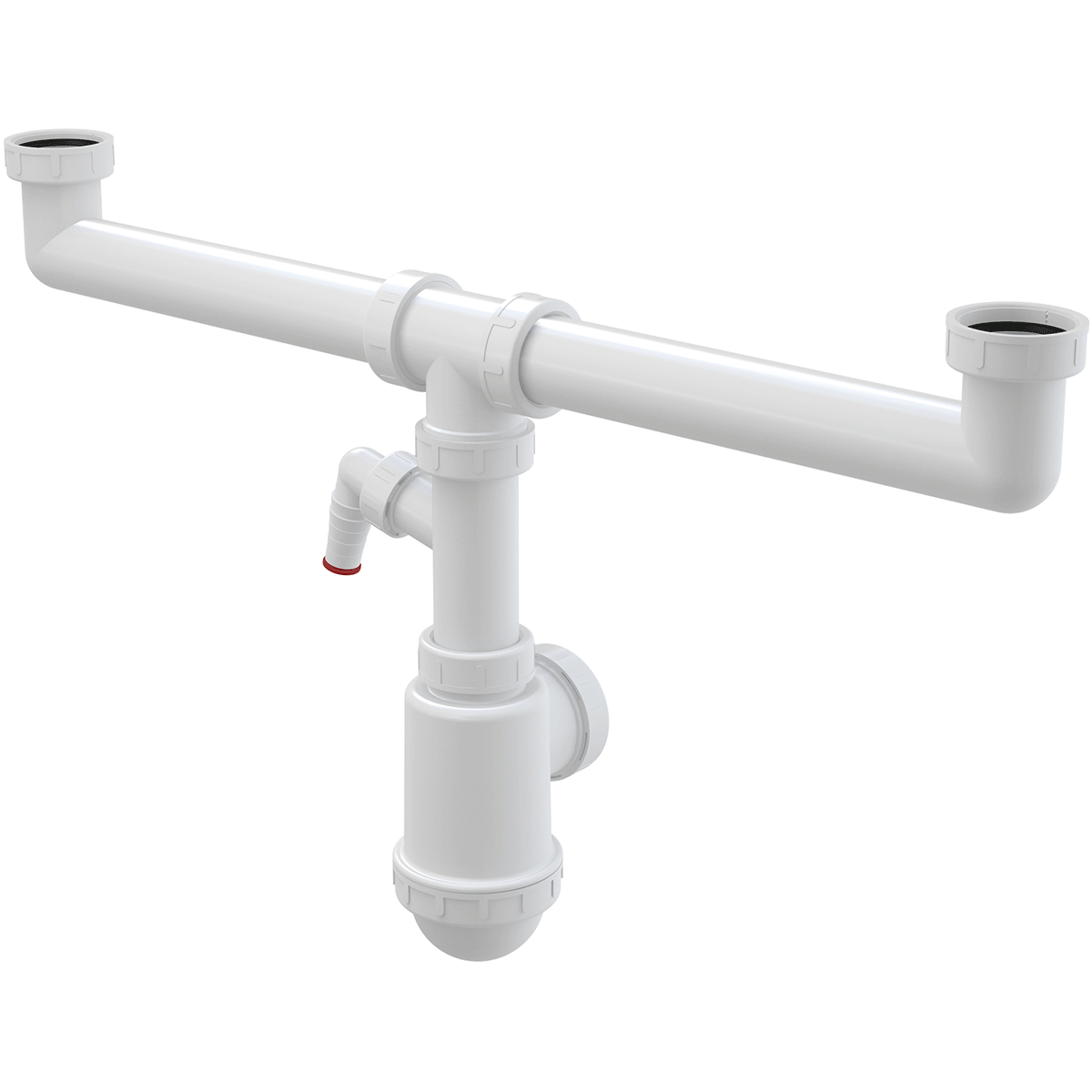 AlcaPlast A448P-DN50/40 Сифон для двойной кухонной мойки. Возможность подключения канализационной трубы Ø50 или Ø40 мм. Со штуцером для подключения стиральной или посудомоечной машины. Материал: полипропилен. Резьбовое соединение 6/4" для подключения слива мойки – 2 шт.