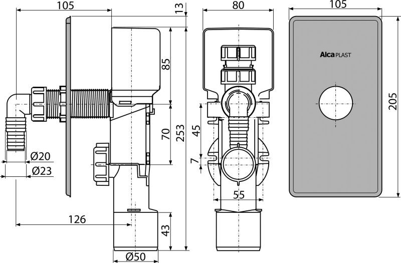 Корпус сифона с разрывным клапаном; Панель из нержавеющей стали; Монтажная прикрывающая панель; Колено. |