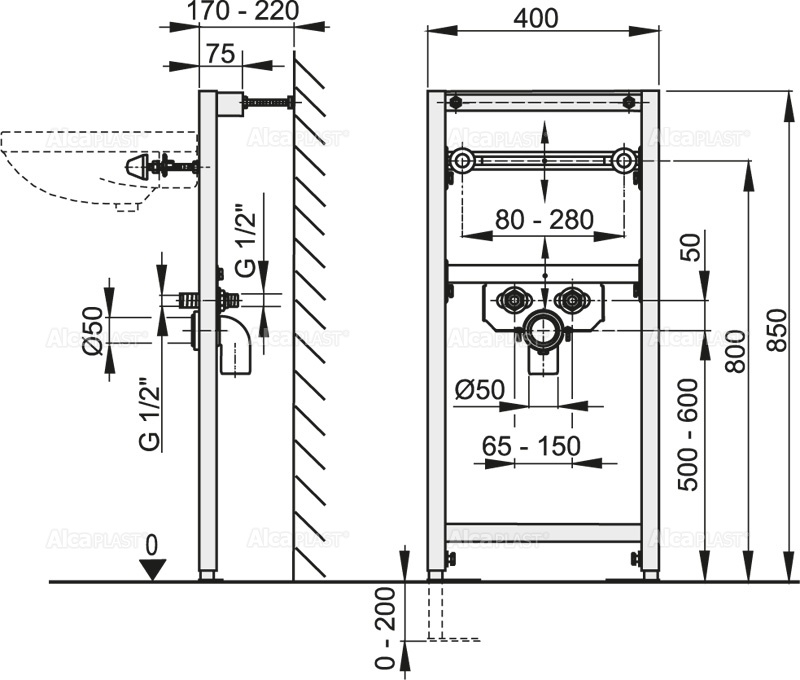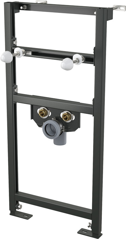 Рама; Монтажный комплект: винт Ø8×60 – 4 шт., дюбель Ø12 – 4 шт.; Монтажный комплект для крепления раковины: винт М10×100 – 2 шт.; Колпаки для закрытия гаек; Резьбовое соединение для подключения воды: G1/2″–G1/2″; Стоковое колено HT50 с прокладкой. |