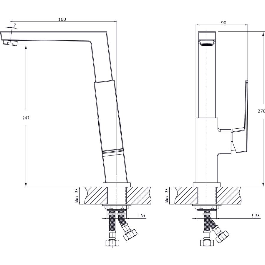 В смеситель установлен картридж D-35 с керамическими пластинами. Высота смесителя 270 мм. Излив поворотный, 195 мм. Высота излива до аэратора 247 мм. Аэратор изготовлен из пластика с нержавеющим корпусом, угол наклона аэратора- 7 гр.
