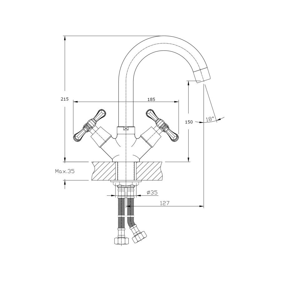 В смеситель установлены кран-буксы (RSH502) с керамическими пластинами. Высота смесителя 215 мм. Излив поворотный 127 мм. Высота излива до аэратора 150 мм. Аэратор изготовлен из пластика с нержавеющим корпусом, угол наклона - 15 гр.