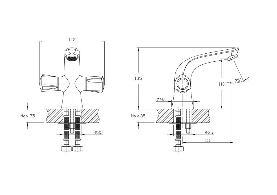 В смеситель установлены кран-буксы (RSH502) с керамическими пластинами. Высота смесителя 135мм. Излив поворотный (360гр), 111 мм. Высота излива до аэратора 110 мм. Аэратор изготовлен из пластика с нержавеющим корпусом, угол наклона - 12 гр.