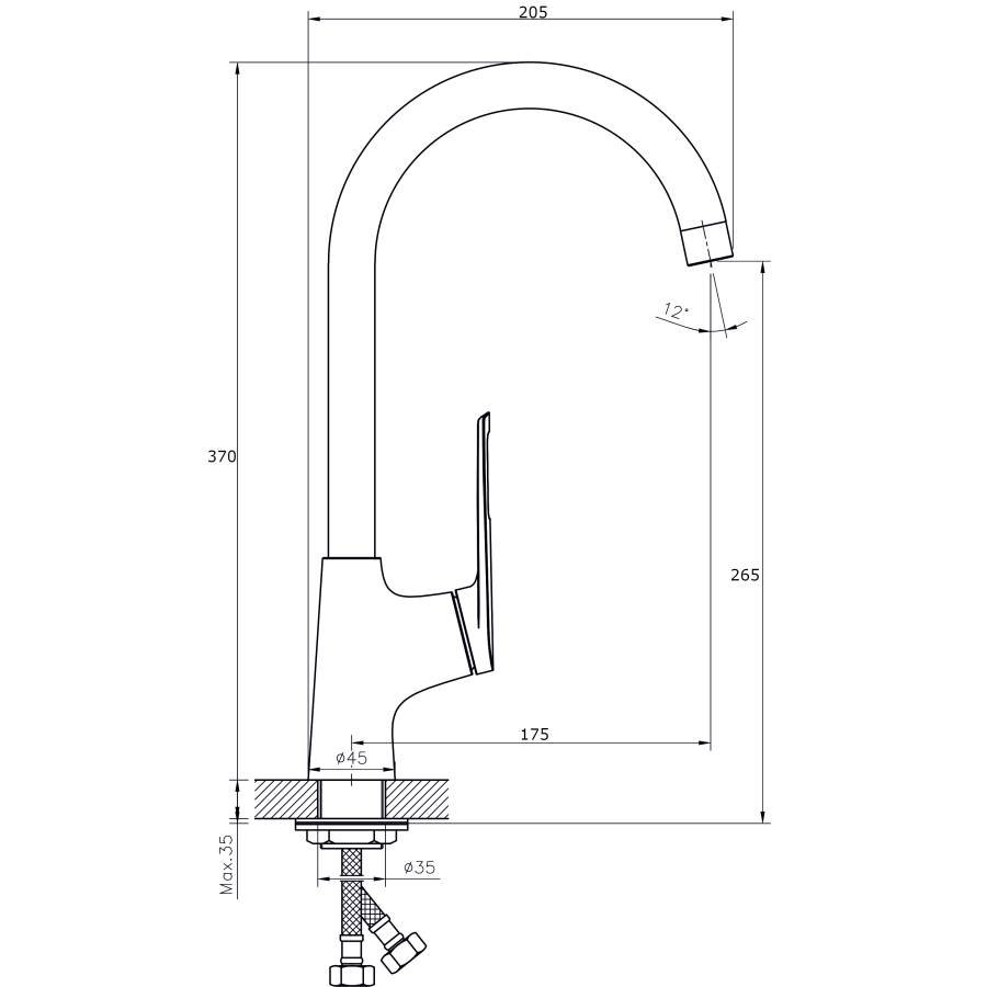В смеситель установлен картридж D-35 с керамическими пластинами. Высота смесителя 394 мм. Излив поворотный, 175 мм. Высота излива до аэратора 265 мм. Аэратор изготовлен из пластика с нержавеющим корпусом, угол наклона аэратора- 12 гр.