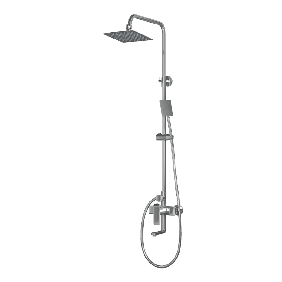 В комплекте 1- режимная душевая лейка, 1-режимный тропический душ, изготовленный из современной прочной пластмассы с никель-хромированным покрытием, душевая штанга, держатель душевой лейки, душевой шланг с латунными гайками 150см, смеситель, индивидуальный пакет, паспорт, гарантийный талон