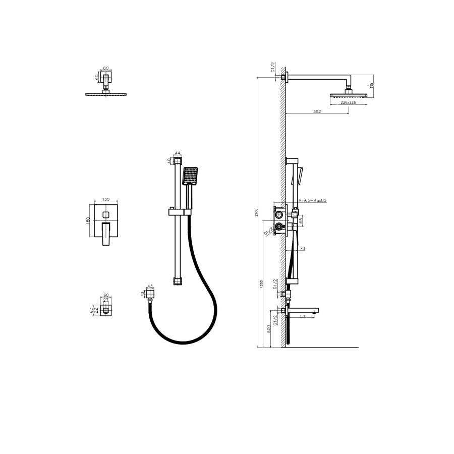Душевая система со смесителем, душевая штанга, душевая лейка, тропический душ, держатель душевой лейки, душевой шланг, фум-лента, паспорт, гарантийный талон, индивидуальный пакет |