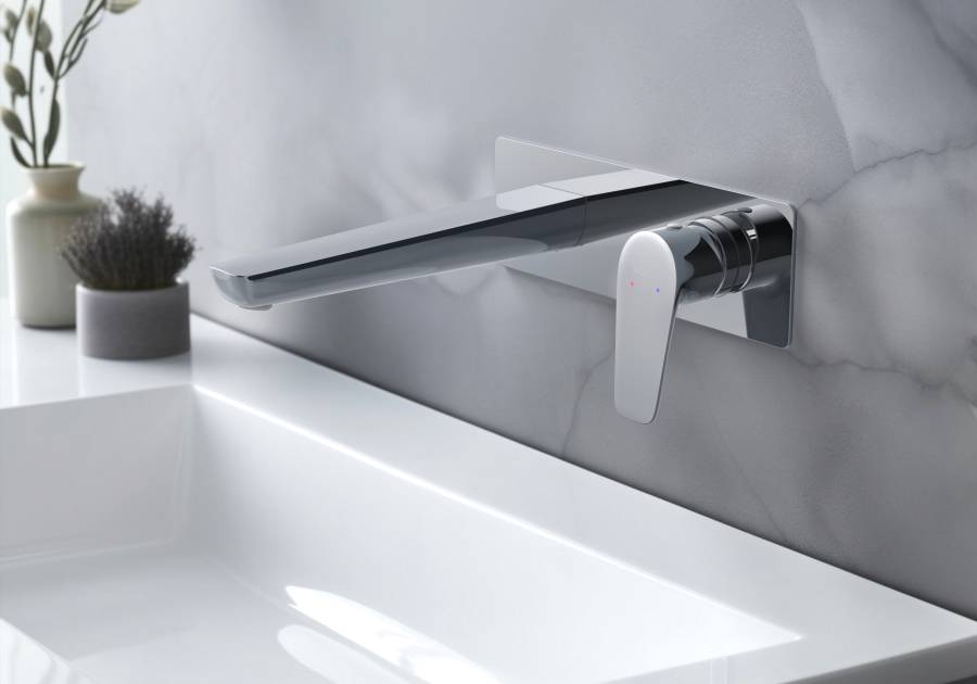 1. Смеситель (внешняя и скрытая часть) 2. Декоративная накладка на стену из нержавеющей стали 3 мм 3. Излив смесителя |