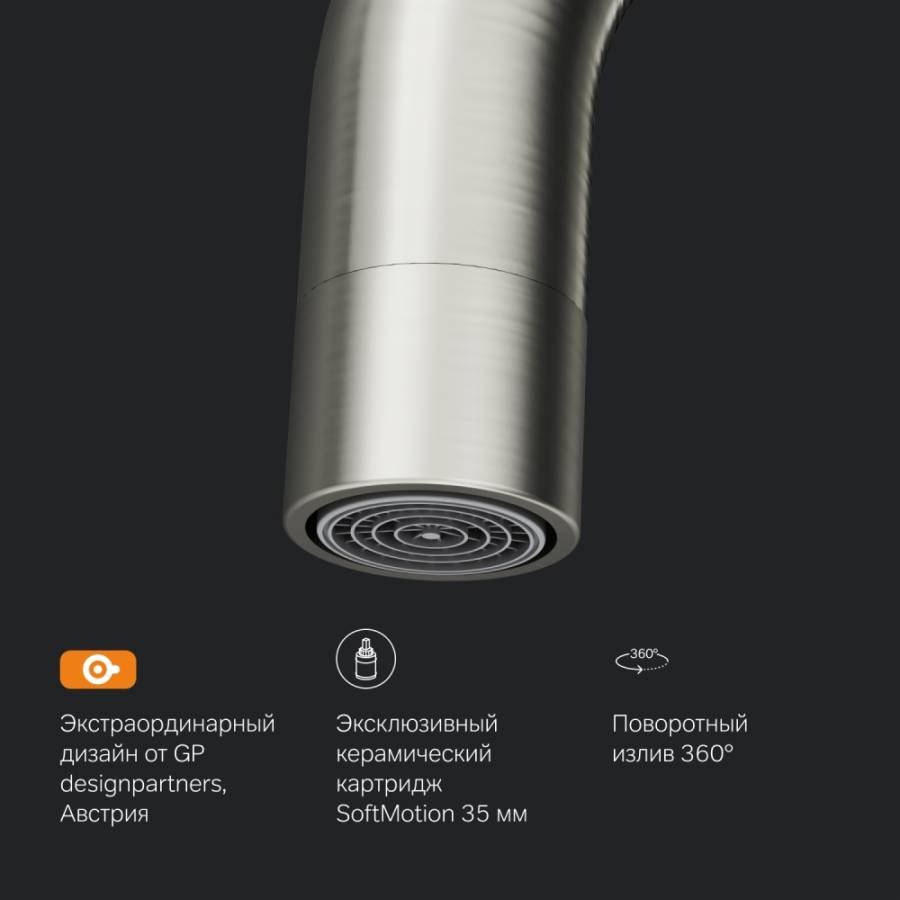 Максимальный комфорт: плавное вращение излива обеспечивает непревзойденное удовольствие от использования и удобство в работе на кухне._x000D_